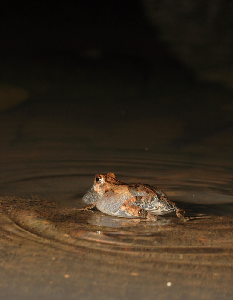 Die Männchen der Tungara-Frösche besitzen eine aufblasbare Hautausstülpung an ihrer Kehle. Diese sogenannte Schallblase wird beim Rufen mit Luft gefüllt, wodurch sie wie ein Verstärker wirkt, der die Rufe um ein Vielfaches lauter werden lässt. Wenn ein Frosch in einem Gewässer sitzt, entstehen durch das rhythmische Aufblähen der Schallblase gleichzeitig auch Wasserwellen kreisförmig um das Tier herum. Und auch wenn die Frösche verstummen, breiten sich diese Wellen noch mehrere Sekunden lang unaufhaltsam weiter aus.